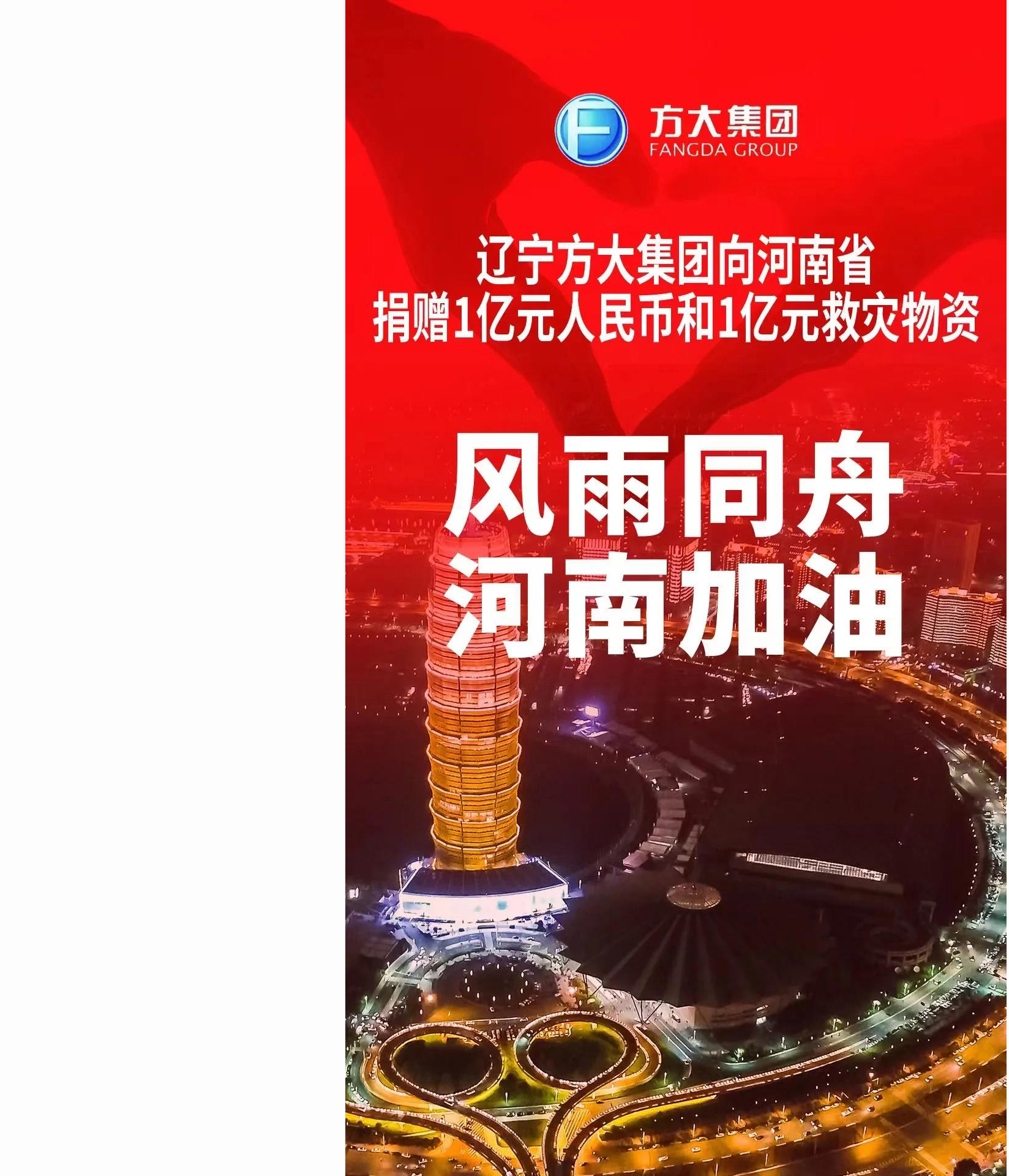 2021年7月,河南等地持续遭遇强降雨,郑州等多地发生特大水灾,防汛形势十分严峻。辽宁方大集团董事局召开专题会议安排部署,迅速联系河南省慈善总会捐赠现金1亿元人民币和价值1亿元的应急救援物资,用于保障当地群众人身安全、紧急采购救灾物资和灾后重建工作。辽宁方大集团荣获“抗洪救灾驰援河南慈善捐赠突出贡献奖”。